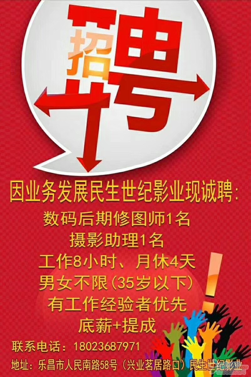 正文摘要:因業(yè)務(wù)發(fā)展民生世紀(jì)影業(yè)現(xiàn)誠(chéng)聘: 數(shù)碼后期修圖師1名、攝影助理1名 工作8小時(shí)、月休4天 男女不限(35歲以下) 有工作經(jīng)驗(yàn)者優(yōu)先 底薪+提成 地址:樂昌市人民南路58號(hào)(興業(yè)茗 ... |